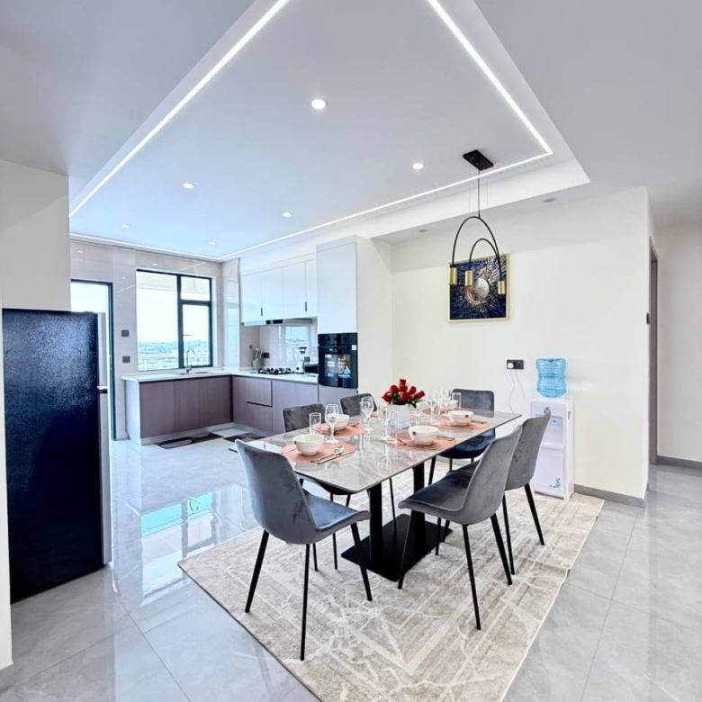 Luxury 3-bedroom apartment in Kilimani, Nairobi, featuring stylish modern interiors and a spacious layout, complemented by premium amenities including a heated swimming pool, fully equipped gym, kids’ play area, garden, and high-speed elevators, with rent inclusive of cleaning, water, and internet, ideal for families or professionals seeking comfort and convenience, available at KSh 250,000 per month.