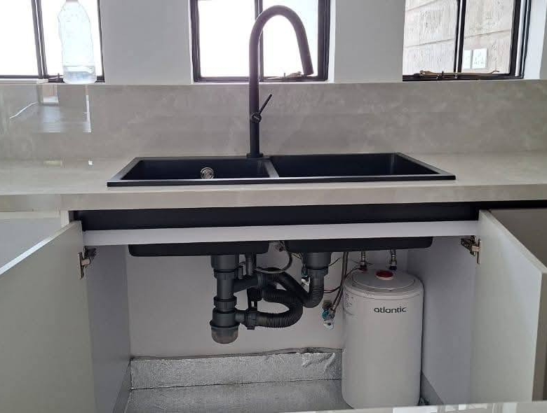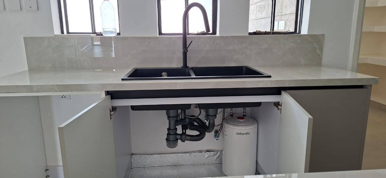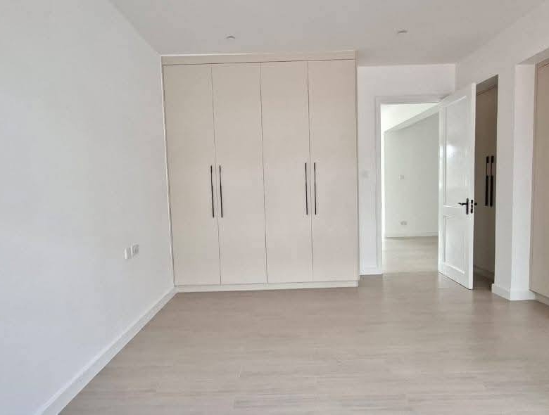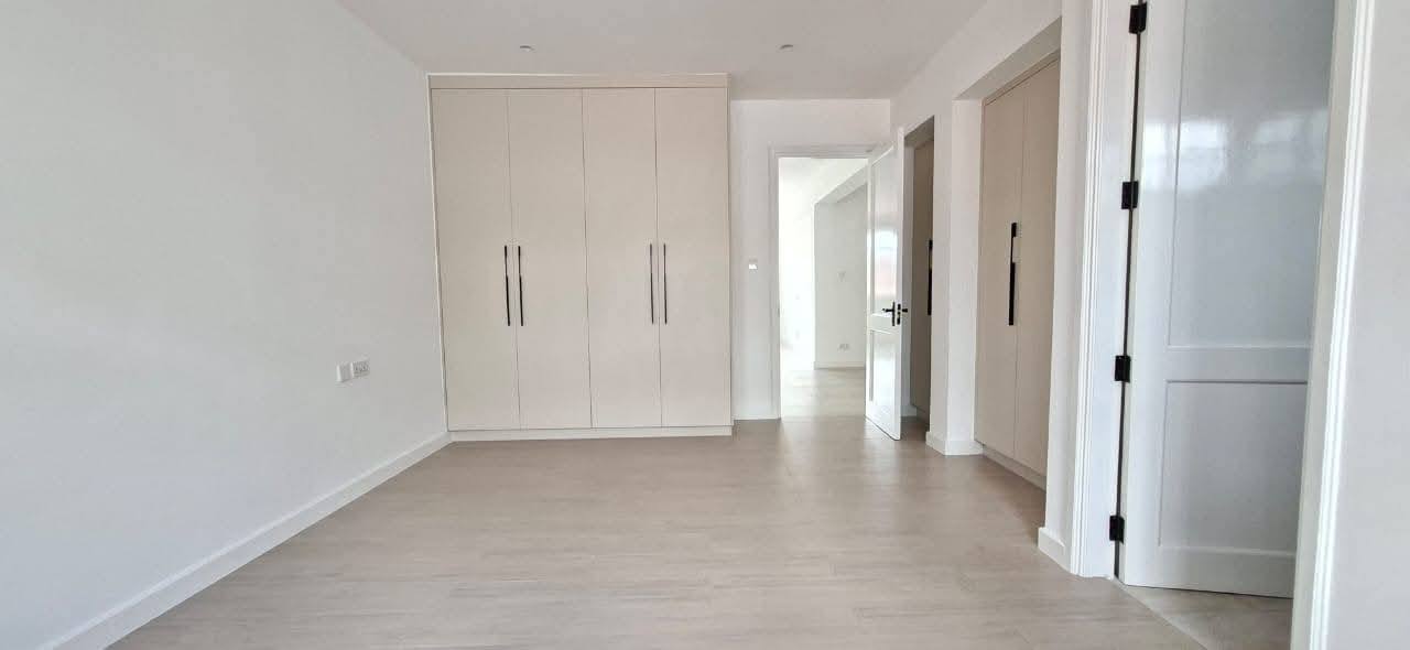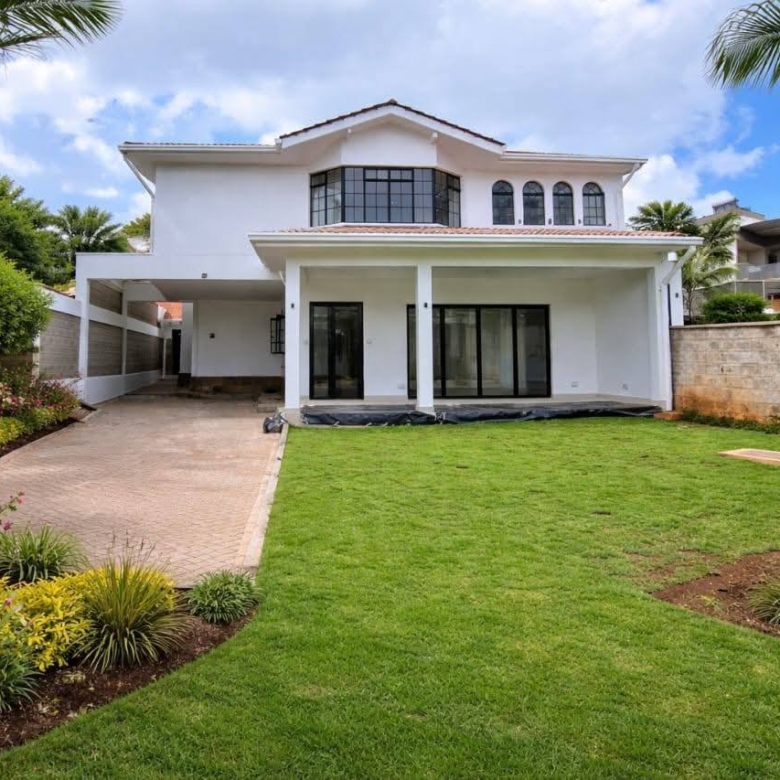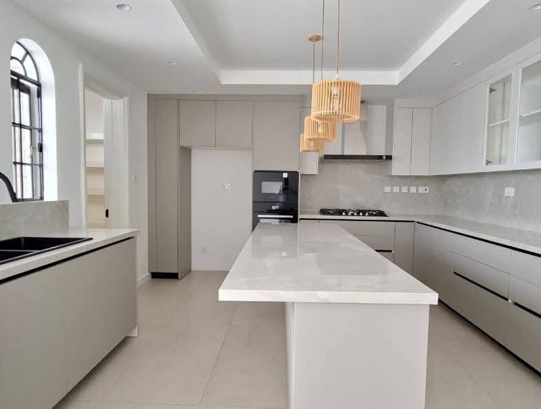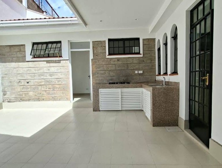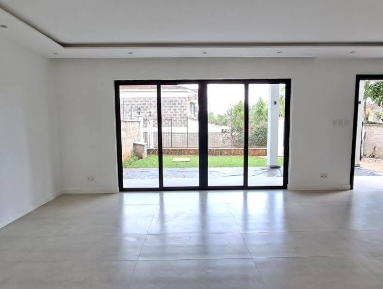 Modern 4-bedroom all en-suite family home in Brookside, Westlands, featuring a spacious lounge with floor-to-ceiling aluminium doors for natural lighting, separate dining area, and a fully fitted kitchen with central island, pantry, and outdoor kitchen with laundry area, complemented by a master bedroom with walk-in closet, backup generator, solar water heating, borehole water supply, ample parking, and EU & UN approved security, offering comfort and elegance in a prime location, available at KES 425,000 per month (service charge inclusive).