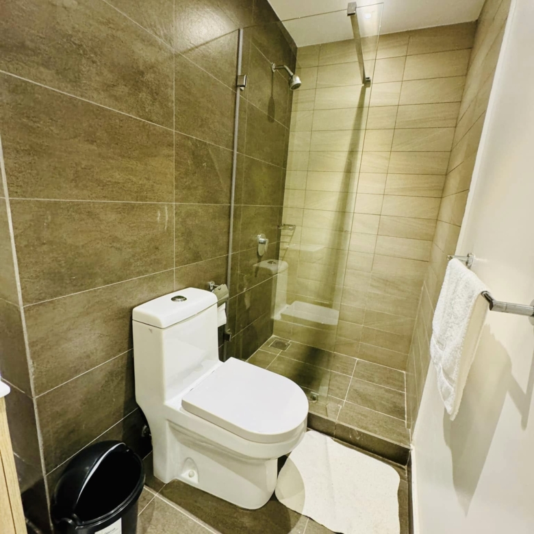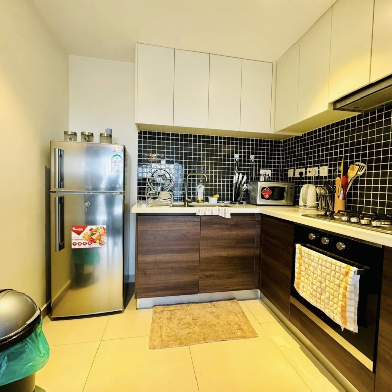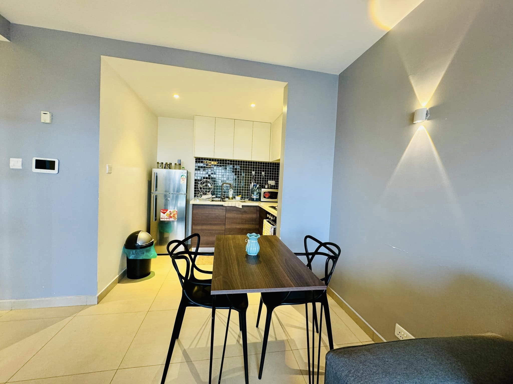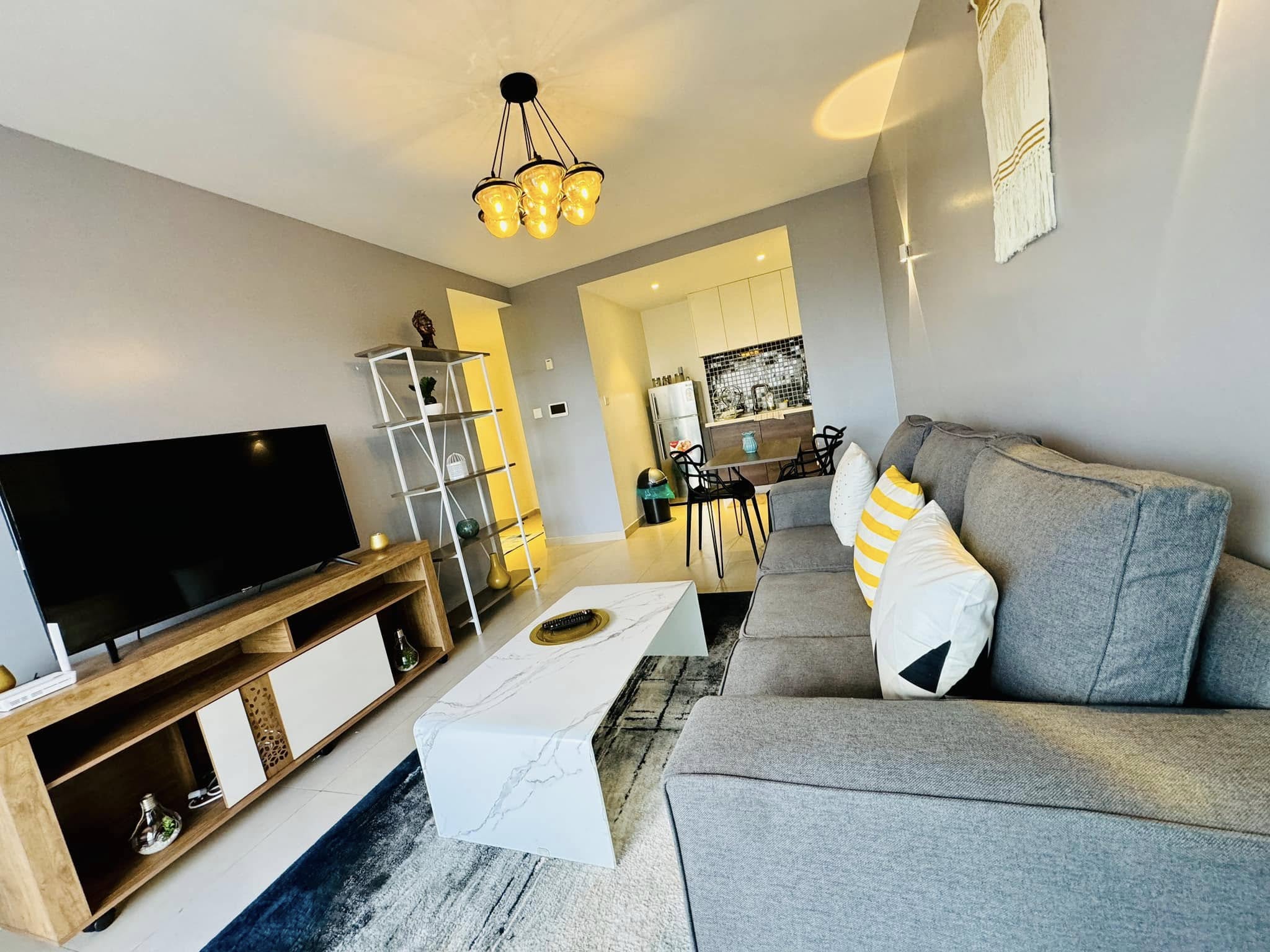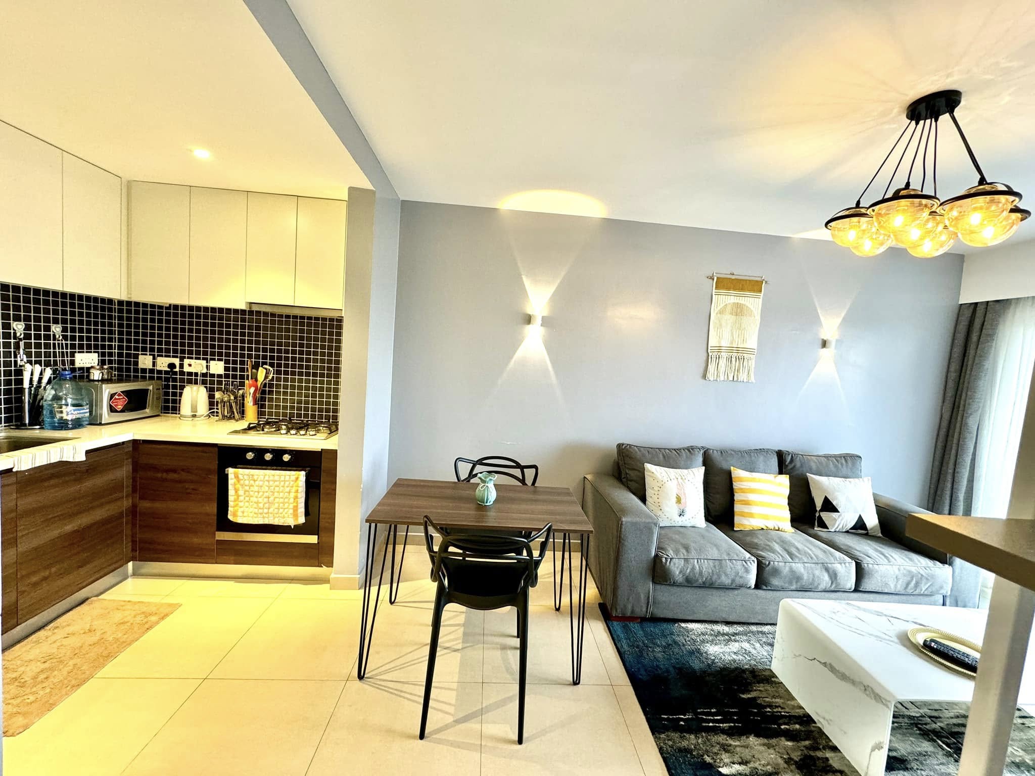 Bright sunrise apartment featuring a cozy living room with a balcony overlooking greenery, a dining area for two, and a modern open-plan fully fitted kitchen, plus a comfortable bedroom with a nook desk and a sleek bathroom, complemented by amenities such as a gym, swimming pool, backup generator, and housekeeping included.