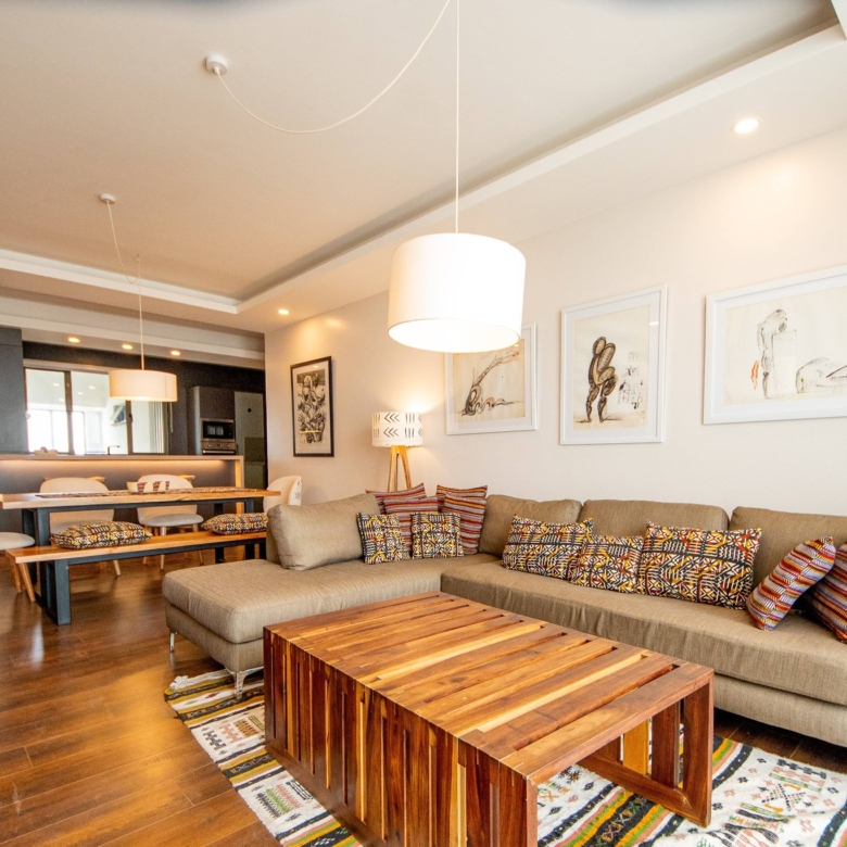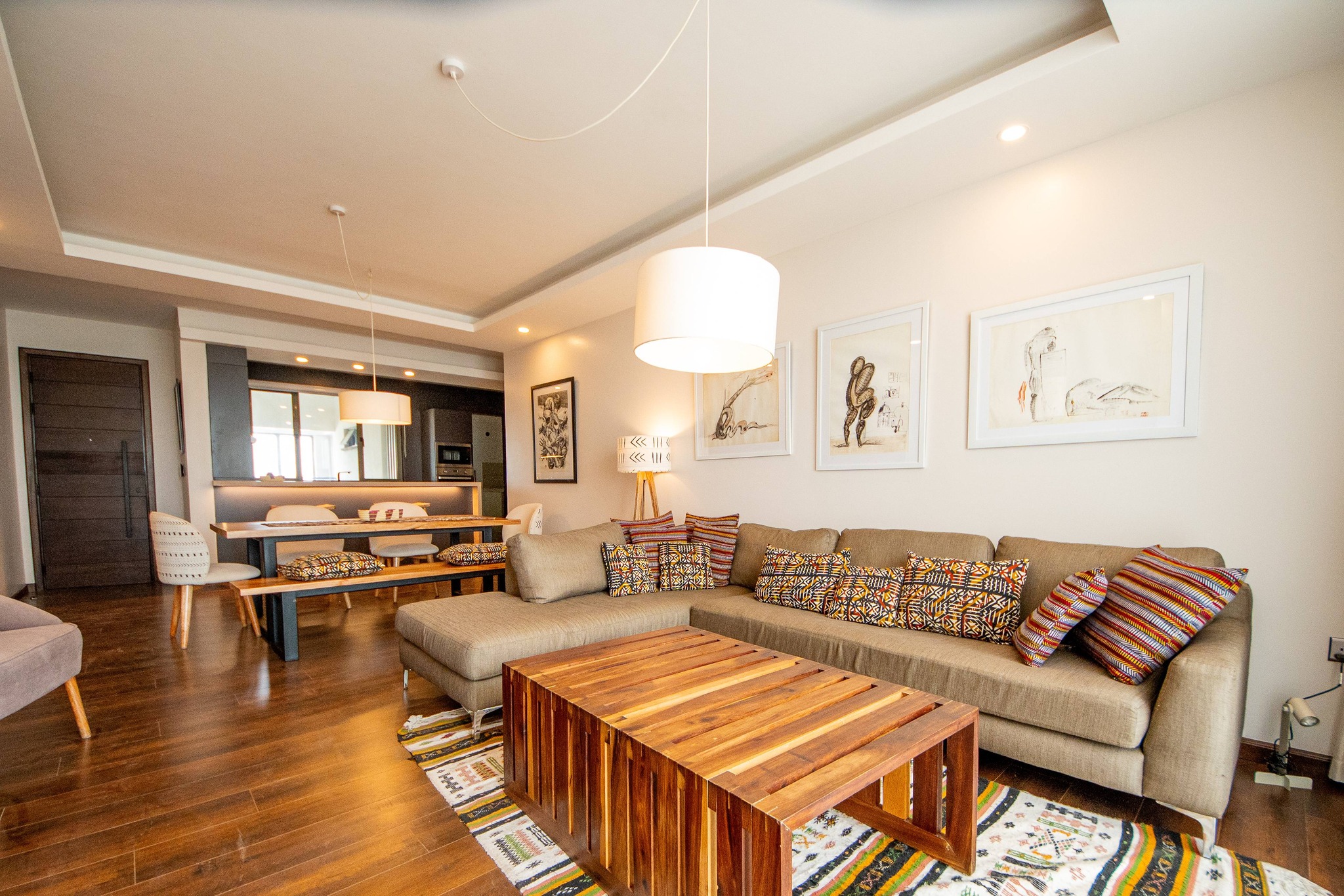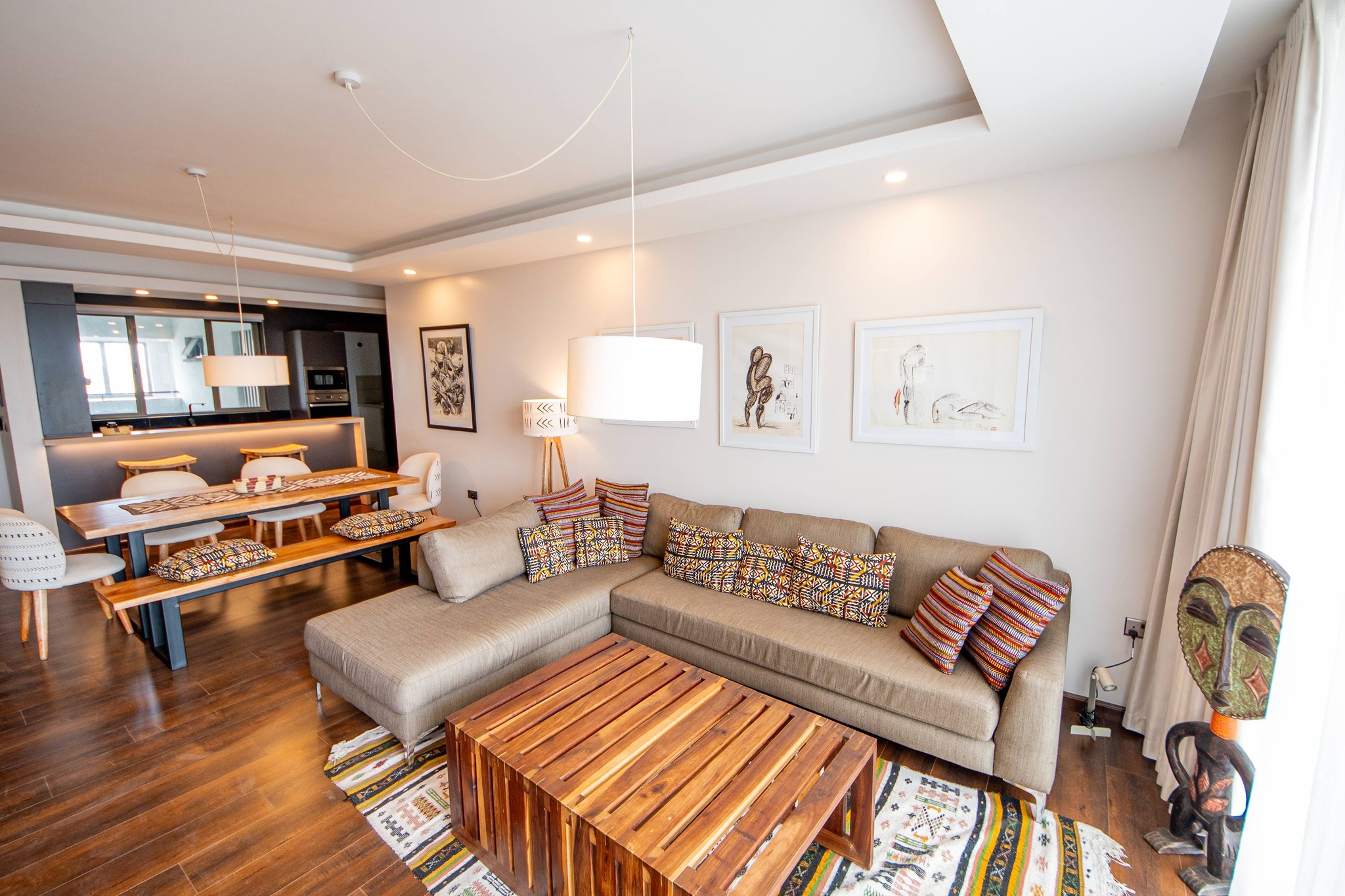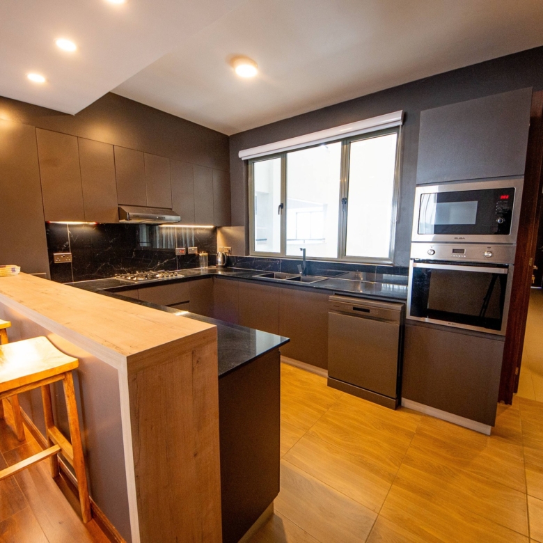 Tastefully furnished 3-bedroom all en-suite apartment with DSQ in Westlands, Nairobi, offering a unique blend of antique accents, modern furniture, and original artwork, featuring semi open-plan living spaces, a spacious lounge opening to a private balcony, a fully fitted kitchen with appliances and utensils, and a dedicated laundry area, complemented by premium amenities including a swimming pool, fully equipped gym, and backup generator, delivering a relaxed yet refined living experience in a prime central location, available at USD 2,100 per month.